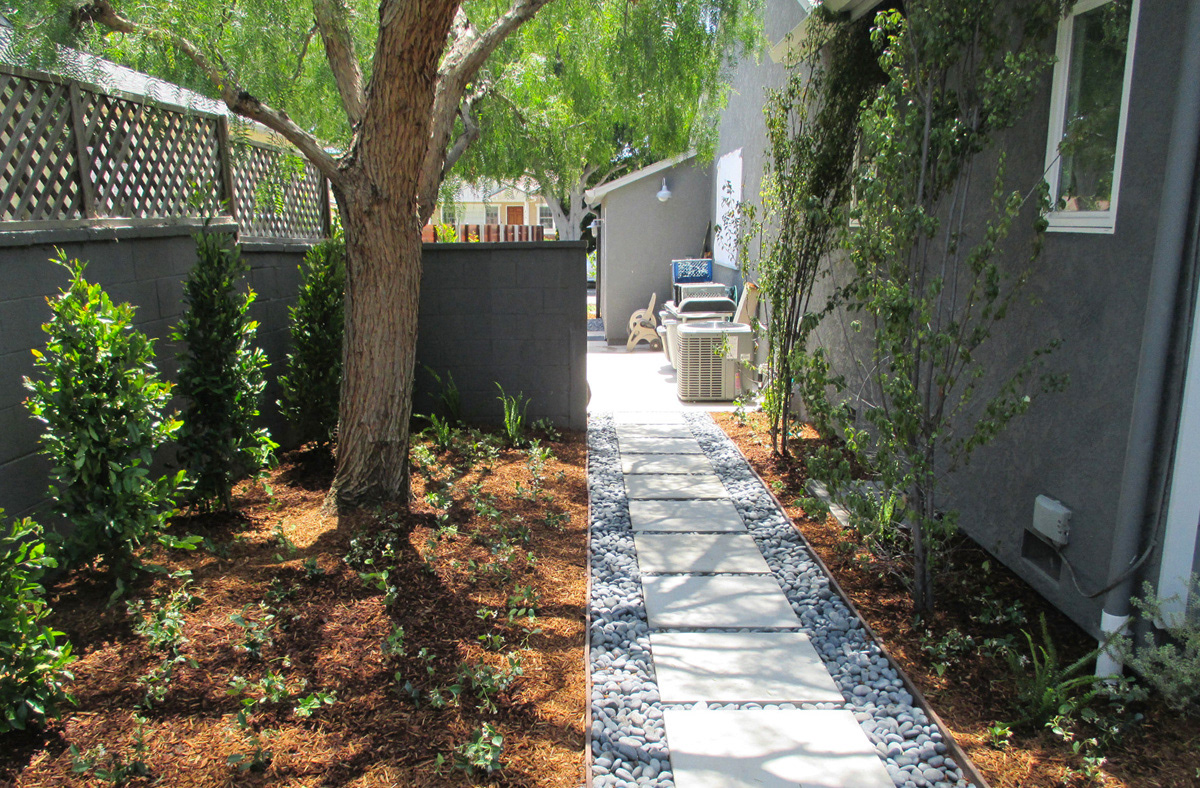 A small touch up to an unattractive side-yard, makes the transition from front to back a more pleasing walk along concrete pavers with river rock joints.